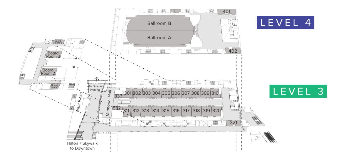- If arriving via skywalk or Hilton Hotel, walk north and follow the signs to the Iowa Events Center.
